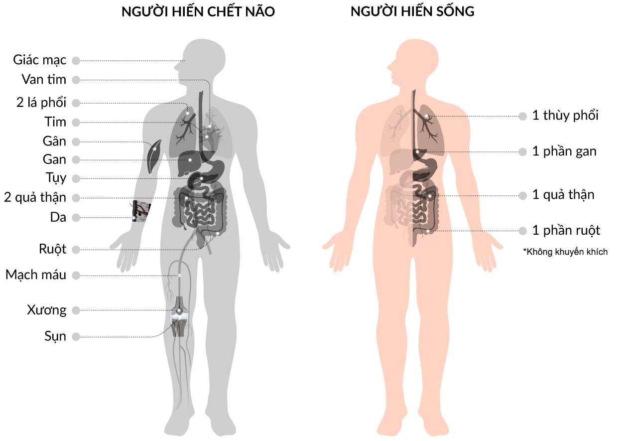 Một người không may rơi vào tình trạng chết não như anh Thiện, khi qua đời, có thể hiến mô tạng, cứu sống tới 8 bệnh nhân suy tạng và hơn 75 người cần mô, da, giác mạc. Đây trở thành nguồn sống quý giá cho hàng nghìn người đang mòn mỏi xếp hàng chờ ghép tạng.